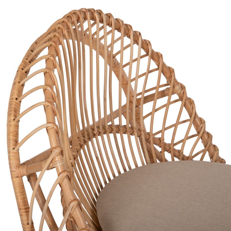 Цялото кресло е изработено от естествен ратан. Ратанът е най-добрият и използван естествен материал за производство на мебели. Ратанът, отглеждан в Югоизточна Азия, е най-висококачественият и най-издръжлив материал от други, отглеждани в други региони. Като цяло ратанът е естествено растящ вид лоза, който е роден в тропическите райони на Австралия, Азия и Африка. С повече от 600 различни вида РАТАНА може да бъде разграничен като силно влакнесто растение, подобно на бамбука и използвано за мебели, защото е лек, издръжлив, гъвкав и привлекателен.