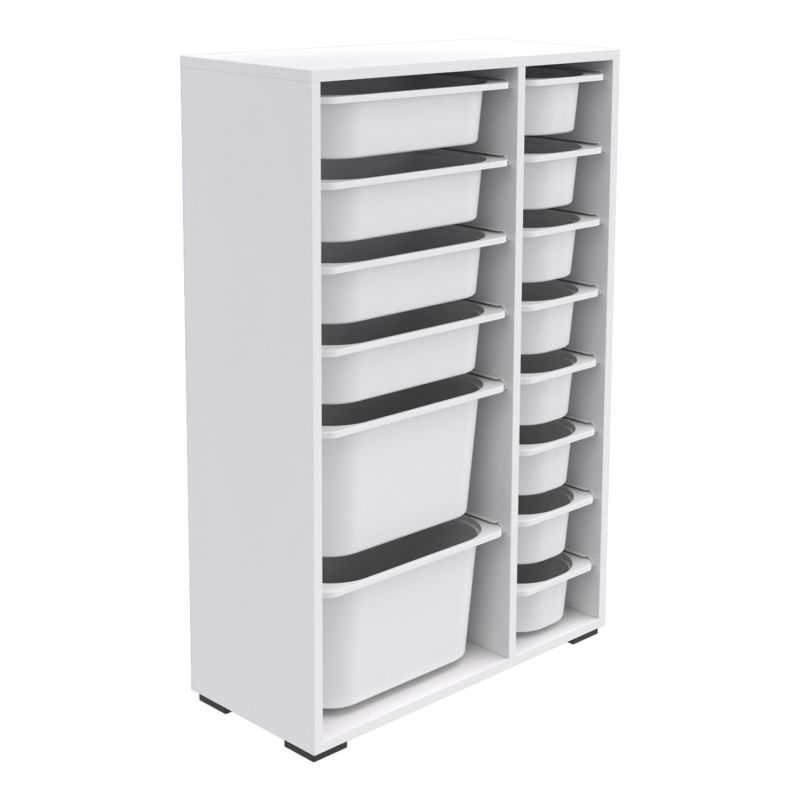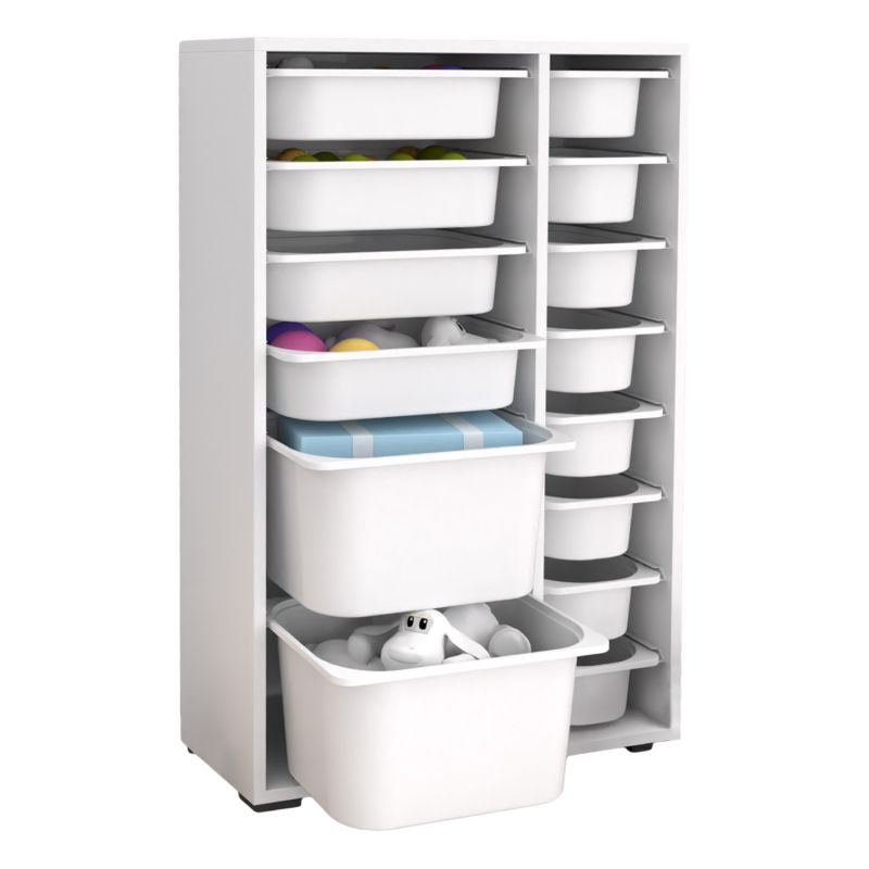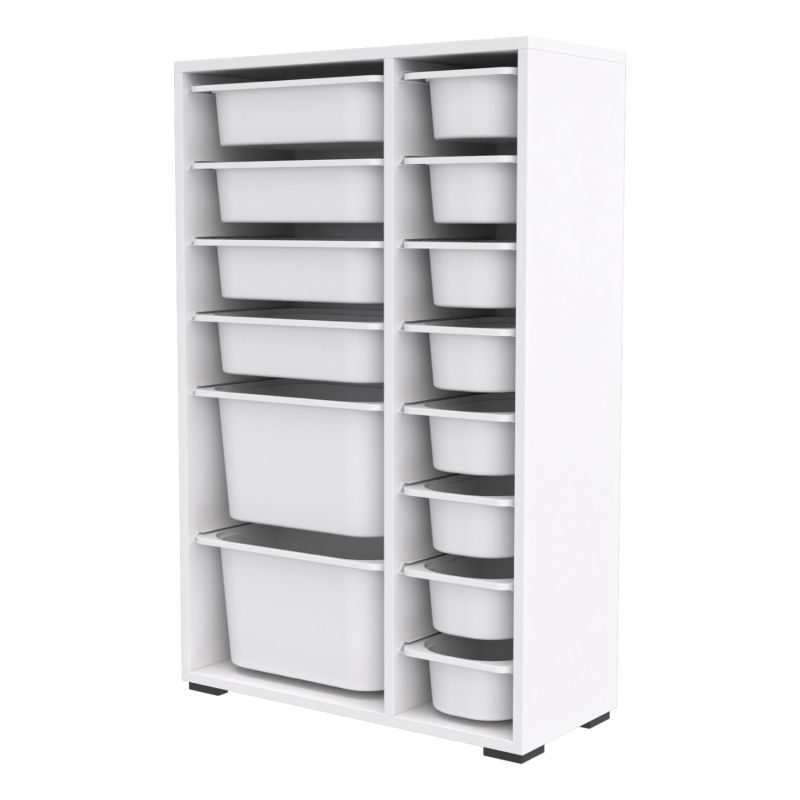 SANI е скрин с меламинова рамка в БЯЛ цвят, с 14 БЕЛИ полиетиленови (пластмасови) чекмеджета в две колони и различни размери. Идеален скрин за по-добра организация на вашата детска стая.