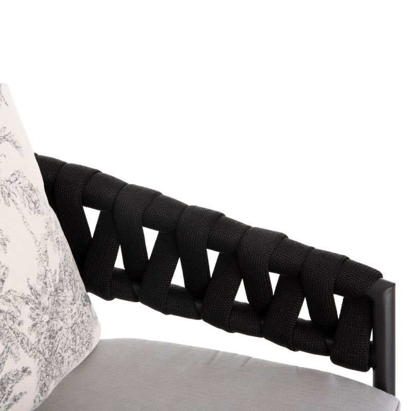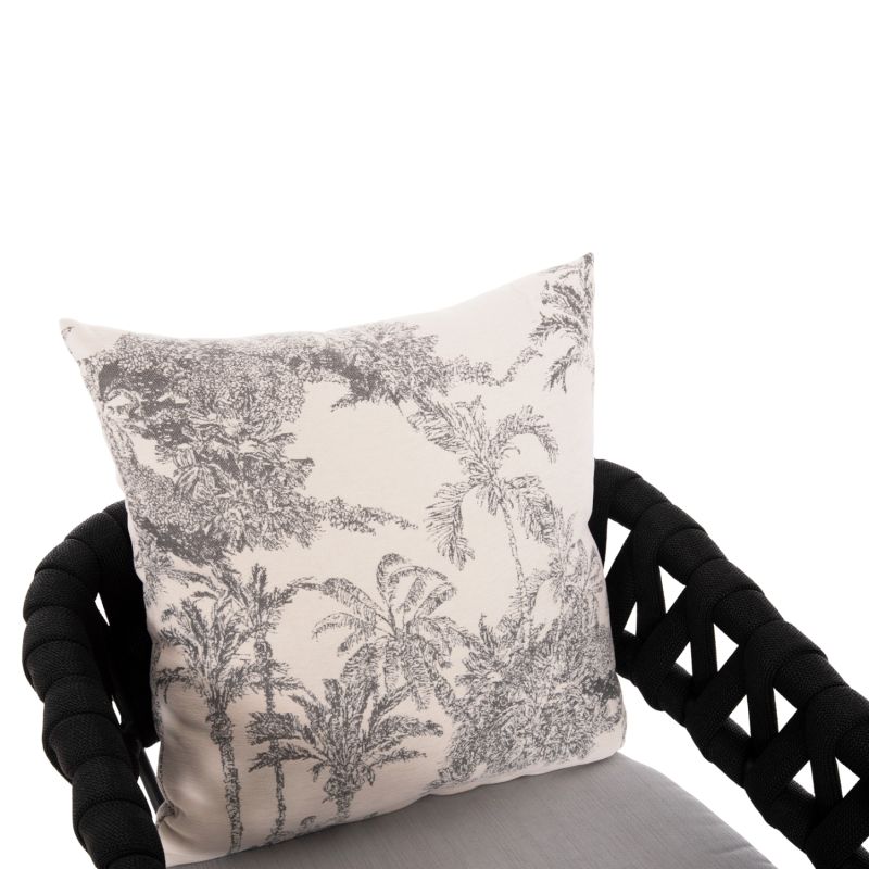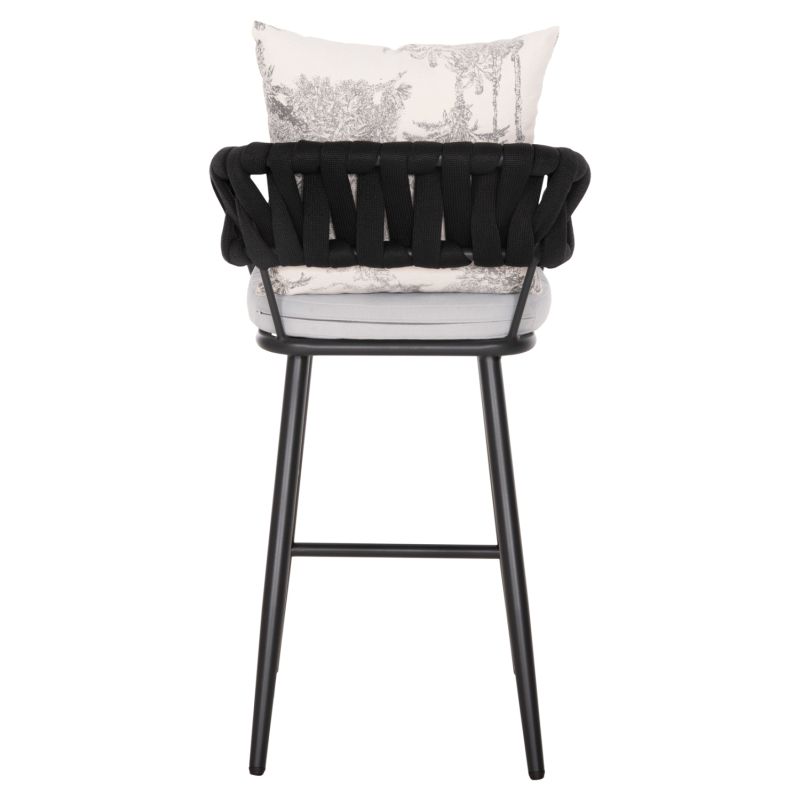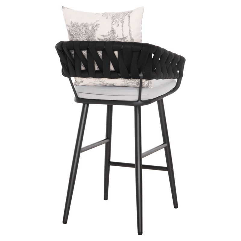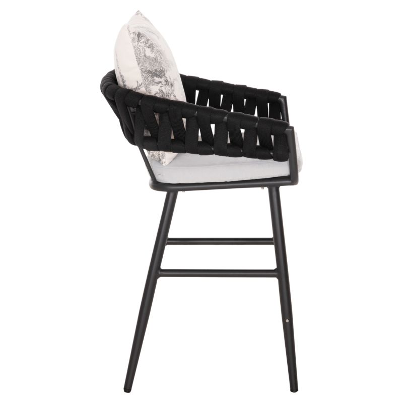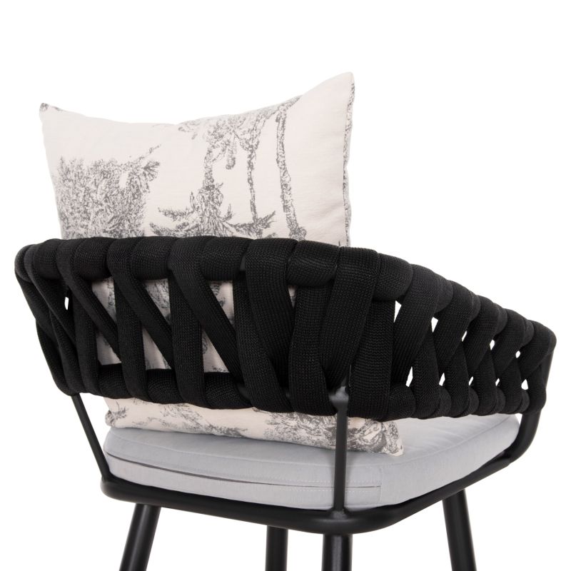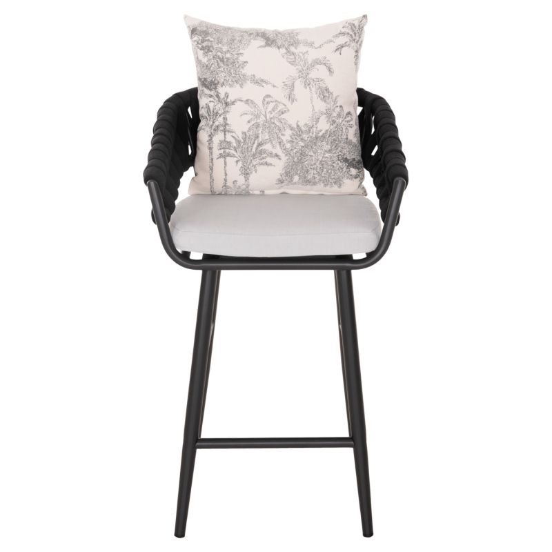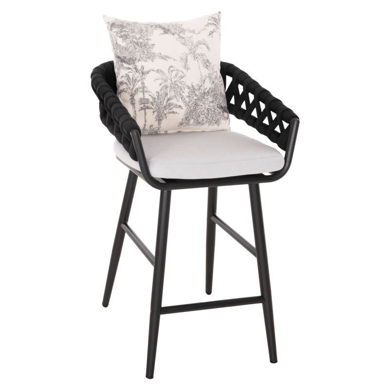 Алуминиев бар стол CAMDEN в цвят АНТРАЦИТ няма отделни рамена, а облегалката е полукръгла, обгръщаща тялото. Това е красива табуретка с ниска облегалка, изработена от синтетично широко полиестерно въже (терилен). Особеното при тази табуретка е, че разполага с удобни възглавници както на седалката в БЯЛ цвят, така и на облегалката в цвят ЕКРЮ с ПРИНТ дизайн.
