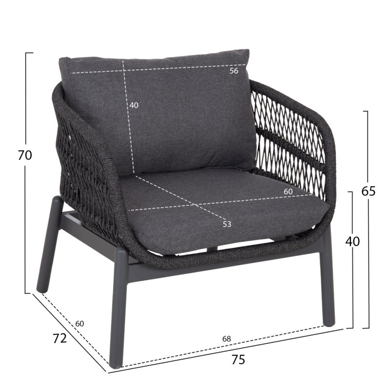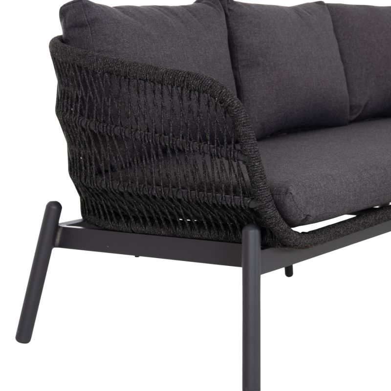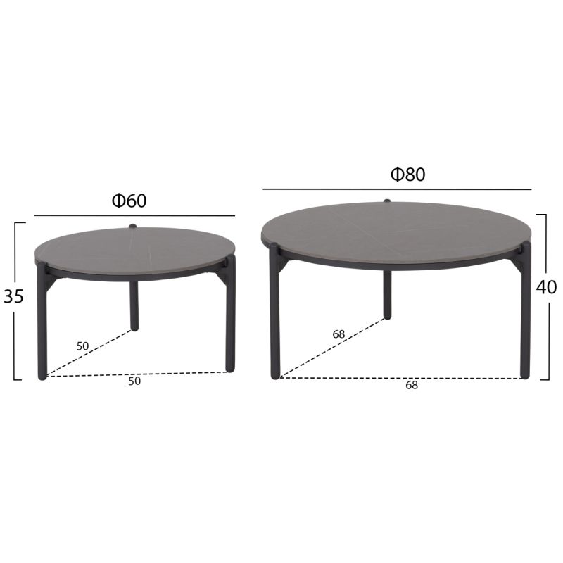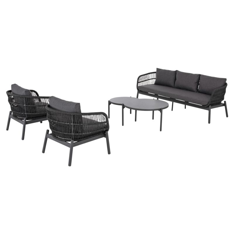 Комплектът включва 3-местен диван, два фотьойла със същия дизайн и две кръгли маси с керамични плотове, създаващи елегантна и функционална зона за сядане на открито.