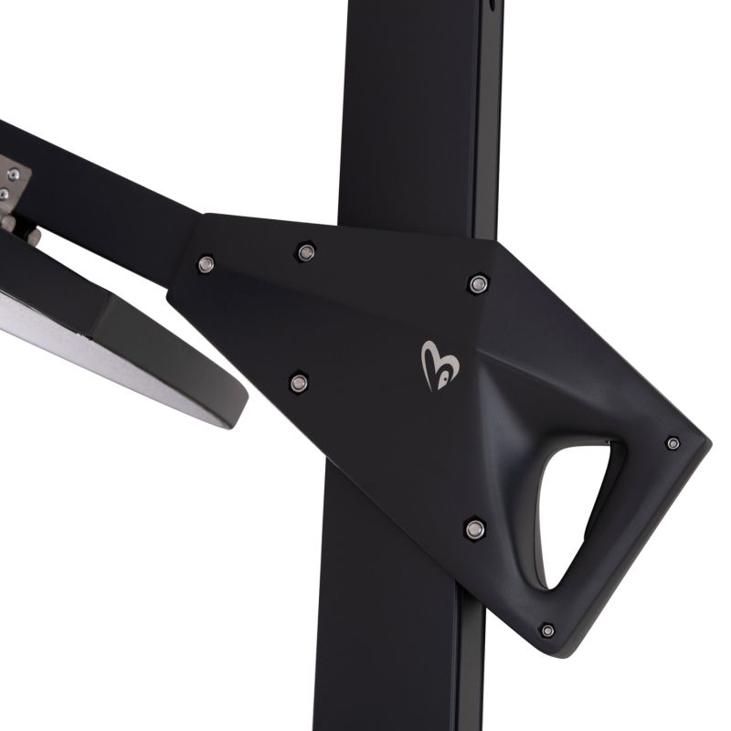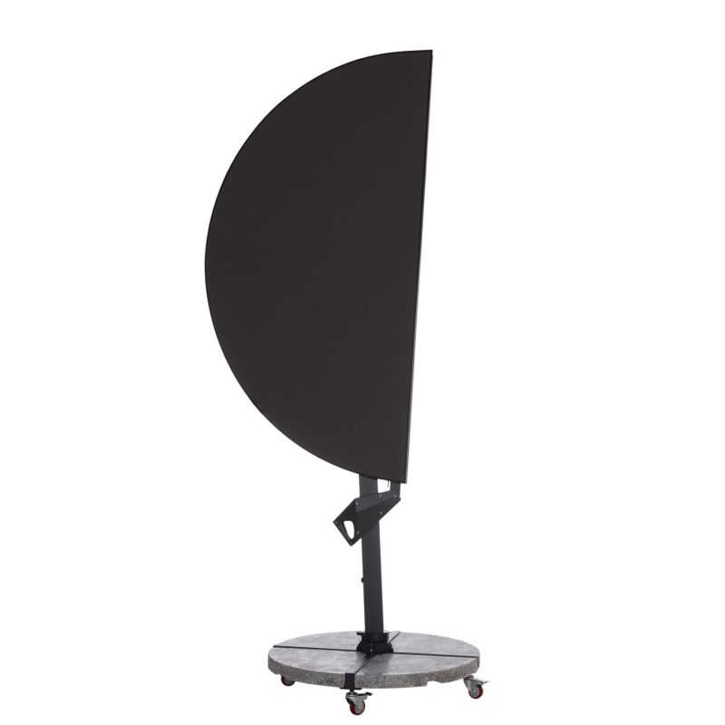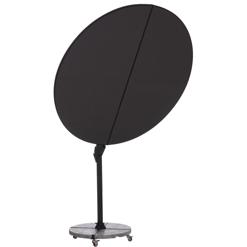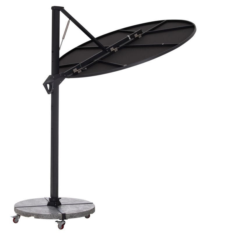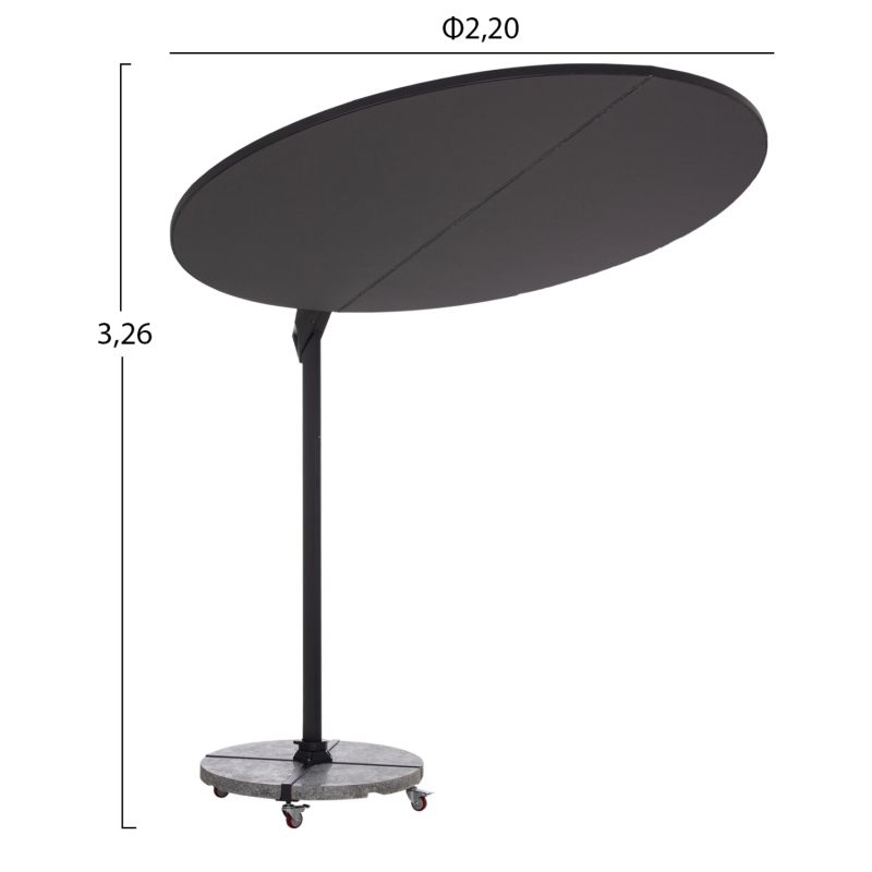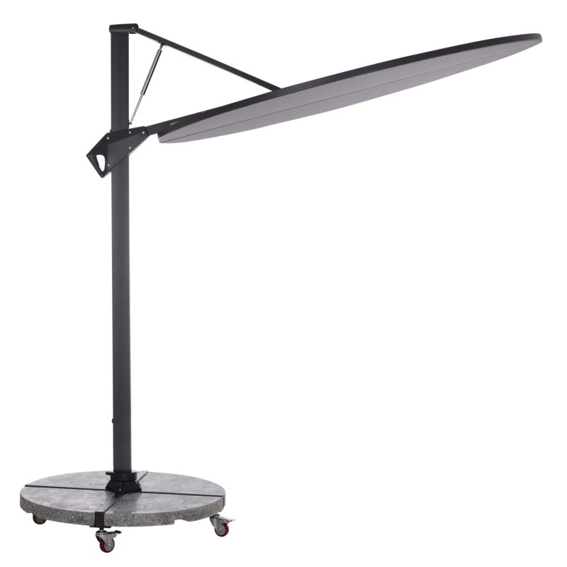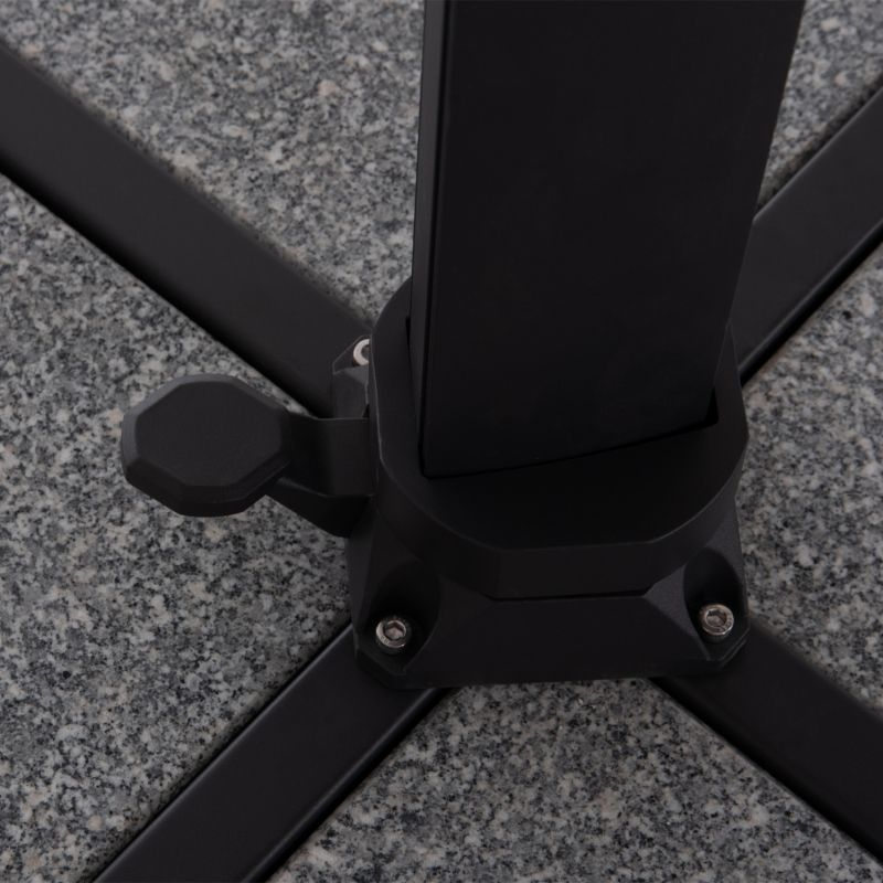 120-килограмовата основа, изработена от естествен гранит, разделена на четири секции в рамките на рамка с кръстовидна форма, предлага абсолютна стабилност, докато поцинкованите стоманени колела позволяват чадърът лесно да се мести навсякъде, където пожелаете. Всички части са боядисани в елегантен МОЛИВ СИВ, създавайки модерна и дискретна естетика.