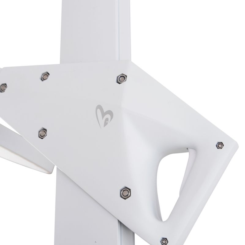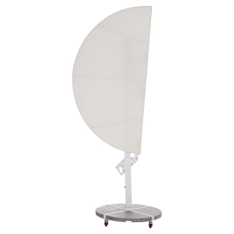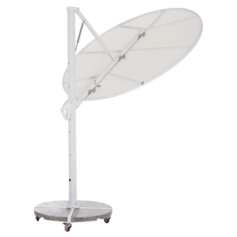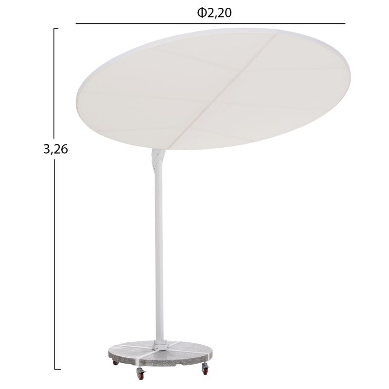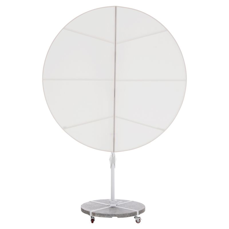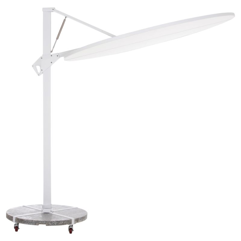 Основата от 120 кг, изработена от естествен гранит, разделена на четири секции в рамките на рамка с кръстовидна форма, предлага абсолютна стабилност, докато поцинкованите стоманени колела позволяват чадърът лесно да се мести навсякъде, където пожелаете. Всички части са боядисани в ярко бяло, създавайки модерна и дискретна естетика.