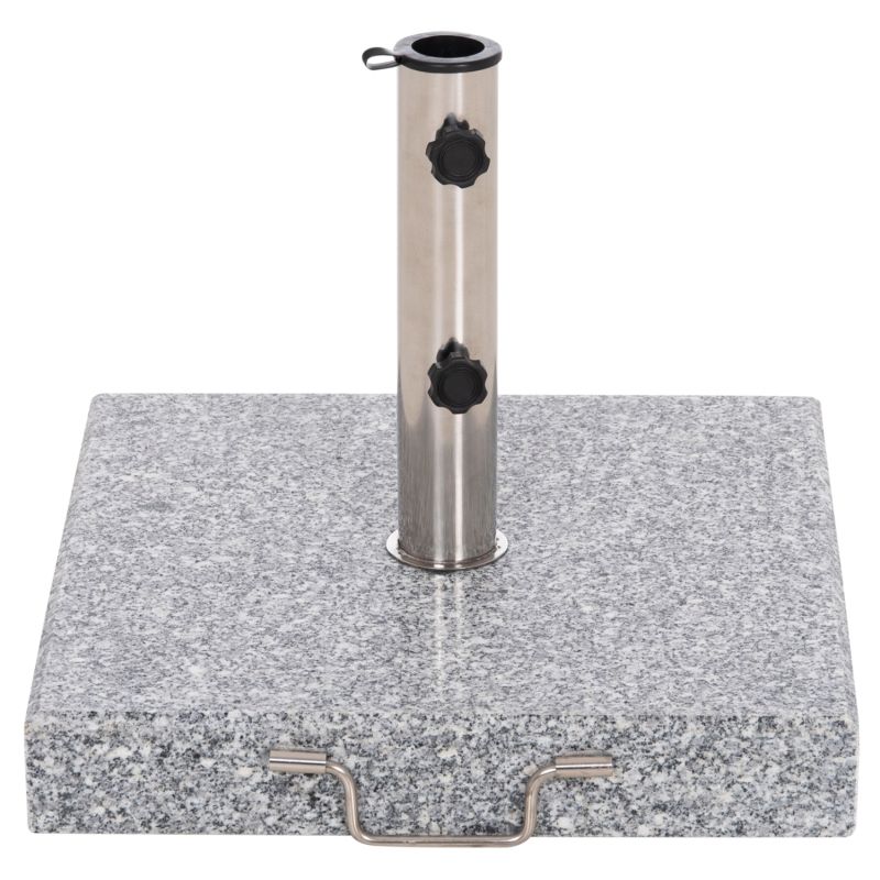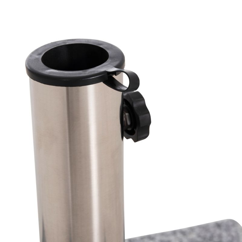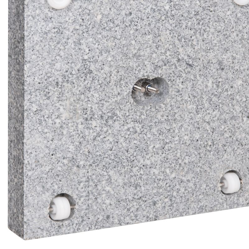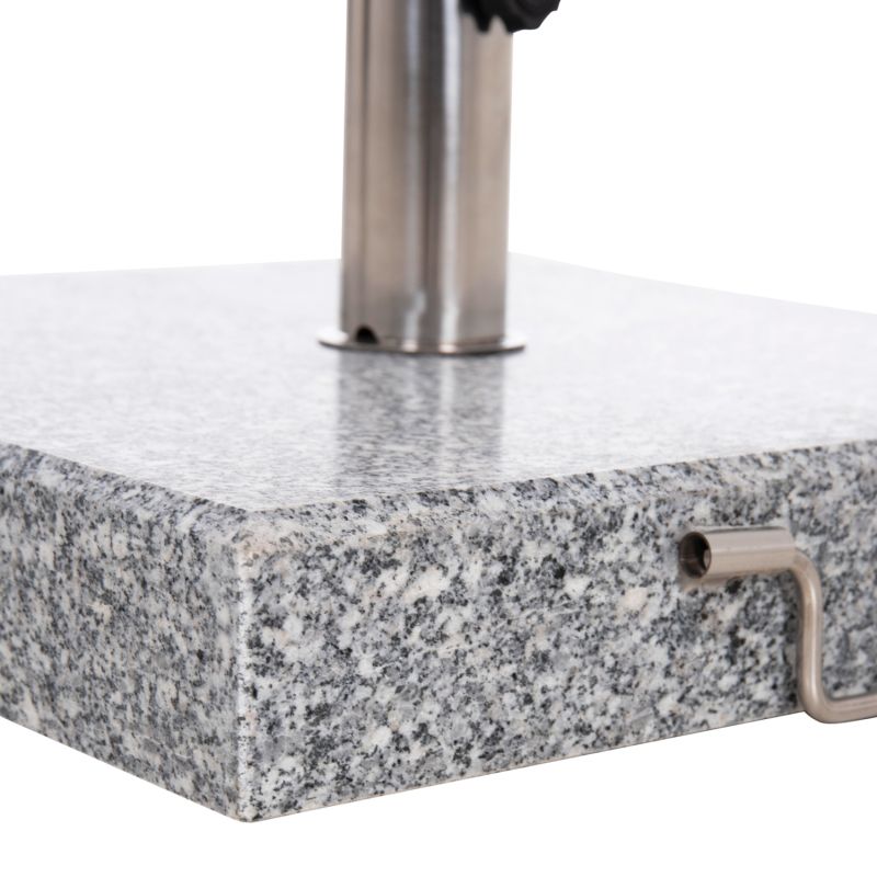 Kвадратна основа, изработена от ГРАНИТ в сив цвят, с тръба от неръждаема стомана с диаметър Φ48 mm, която може да се използва и за по-малки размери със скоби (адаптер). Разполага с дръжка за носене от едната страна и 2 (дискретни) колелца, интегрирани в долната част на основата, което улеснява преместването ѝ, ако е необходимо.