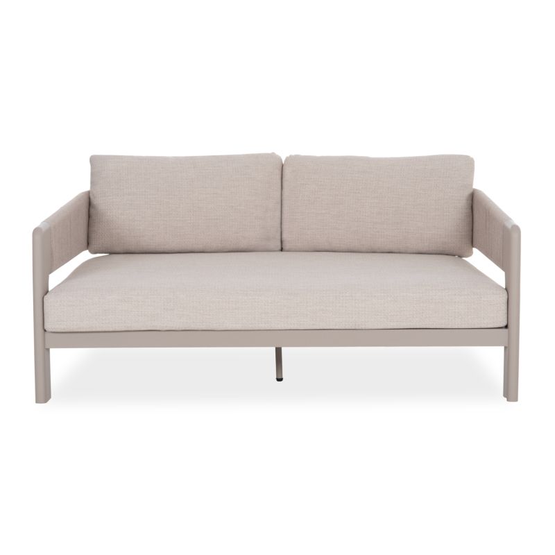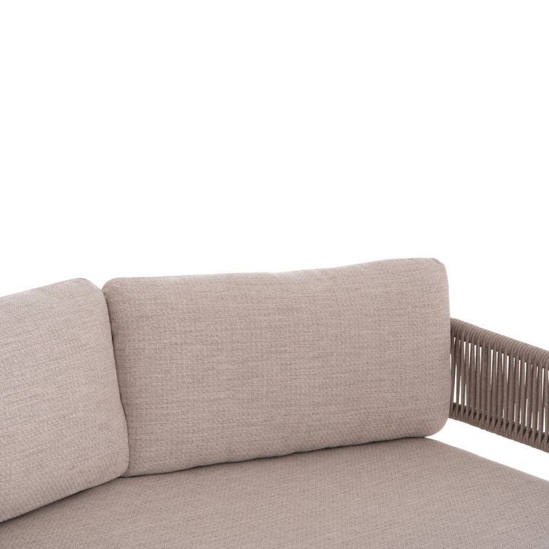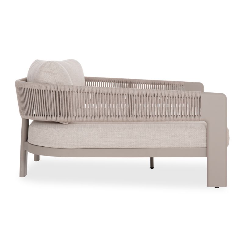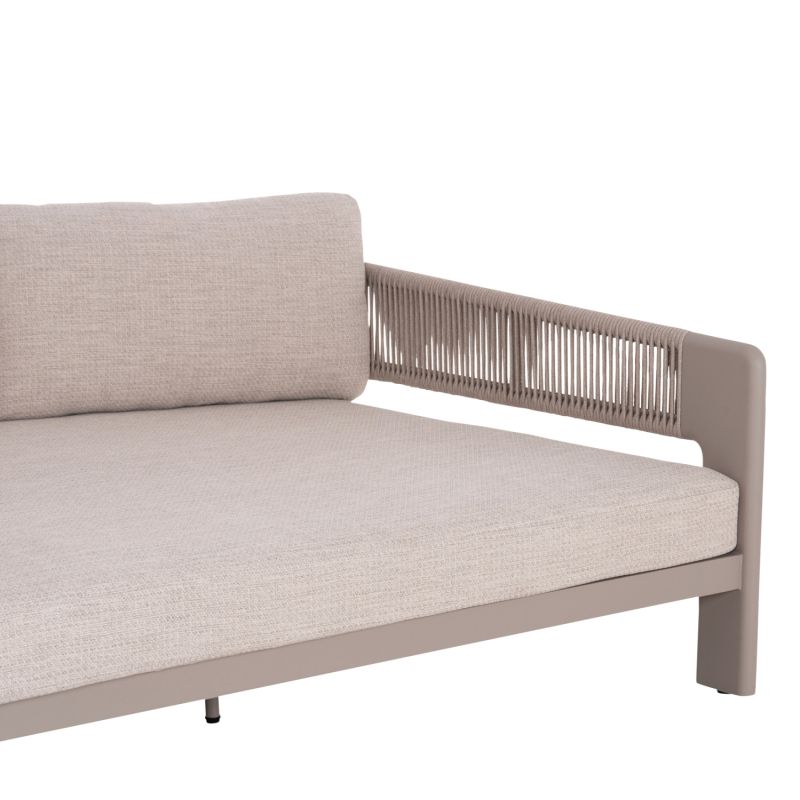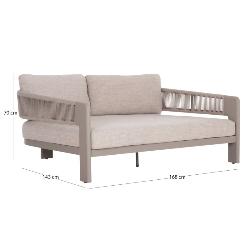 Кушетката е изработена от алуминий, въжетата на облегалката и подлакътниците са в доминиращ БЕЖОВ цвят, както и свалящите се калъфки за възглавници. Внесете максимален комфорт във вашето външно пространство със стил!